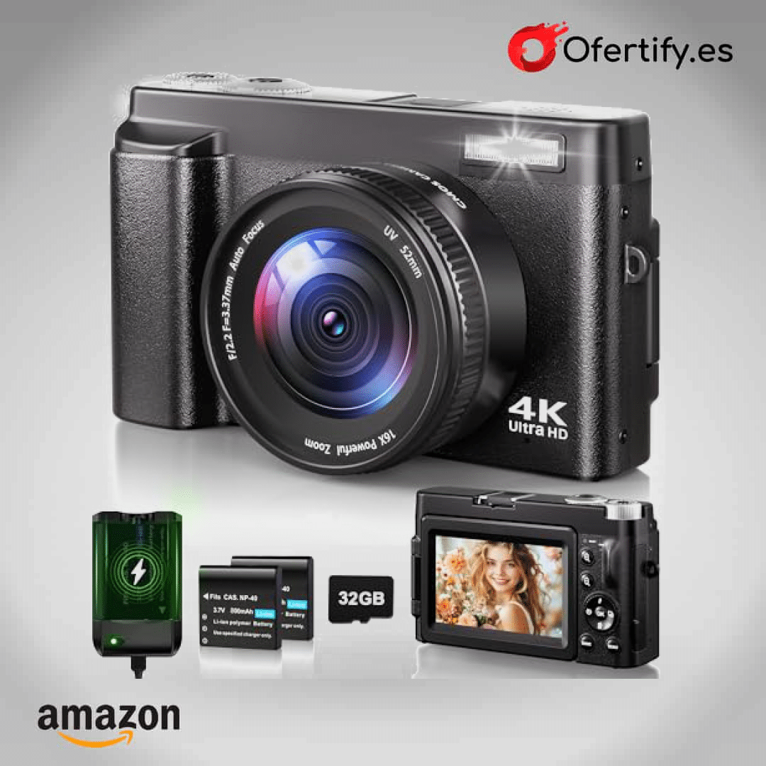– Pantalla Abatible de 3 Pulgadas & Estación de Carga: la pantalla de 3 pulgadas puede girar 180 grados, perfecta para selfies y vlogging. El paquete incluye una estación de carga universal CS-40 y dos baterías recargables de 800 mAh, que brindan energía duradera para sesiones de fotografía prolongadas. Además, la cámara viene con una tarjeta de memoria de 32 GB, lo que te brinda mucho espacio para almacenar tus fotos y videos, para que puedas seguir capturando sin interrupciones