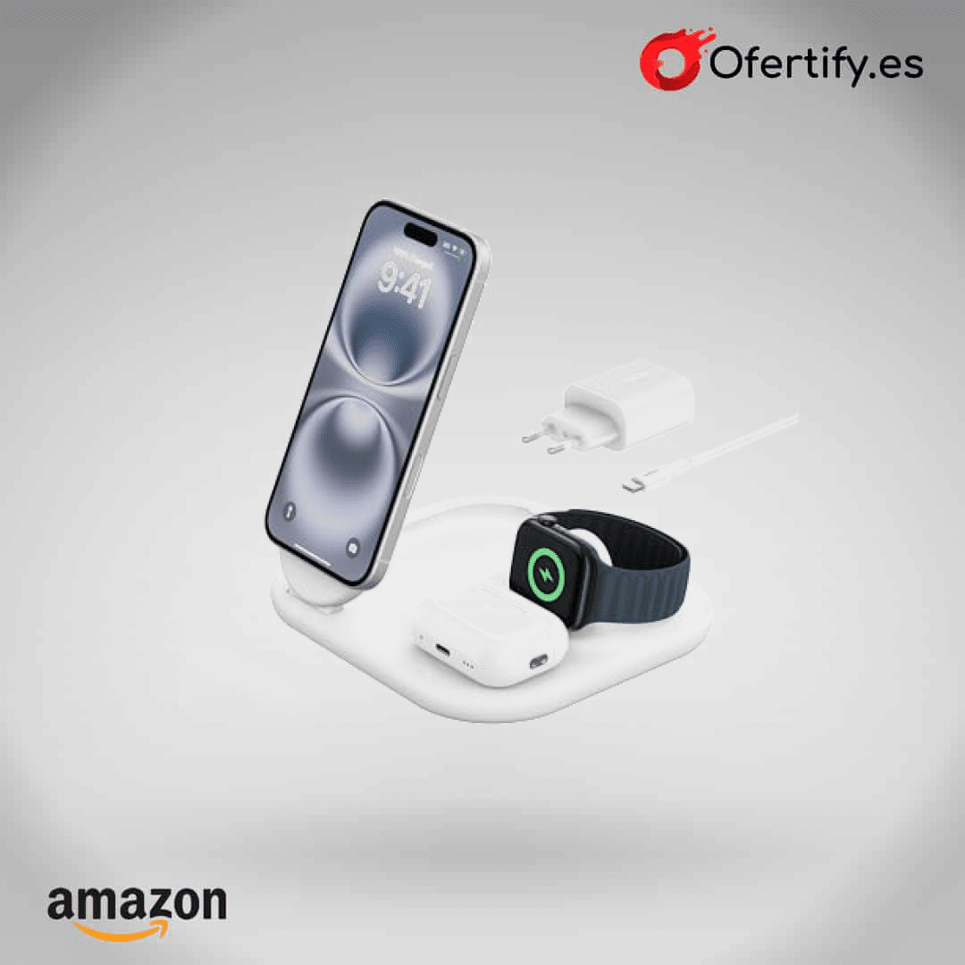 – CARGA RÁPIDA Qi2: coloca con comodidad tu iPhone u otro móvil compatible con Qi2 en la superficie de carga magnética (en vertical u horizontal) y llena su batería con hasta 15 W. Con Qi2 obtendrás una carga inalámbrica hasta 2 veces más veloz*.
