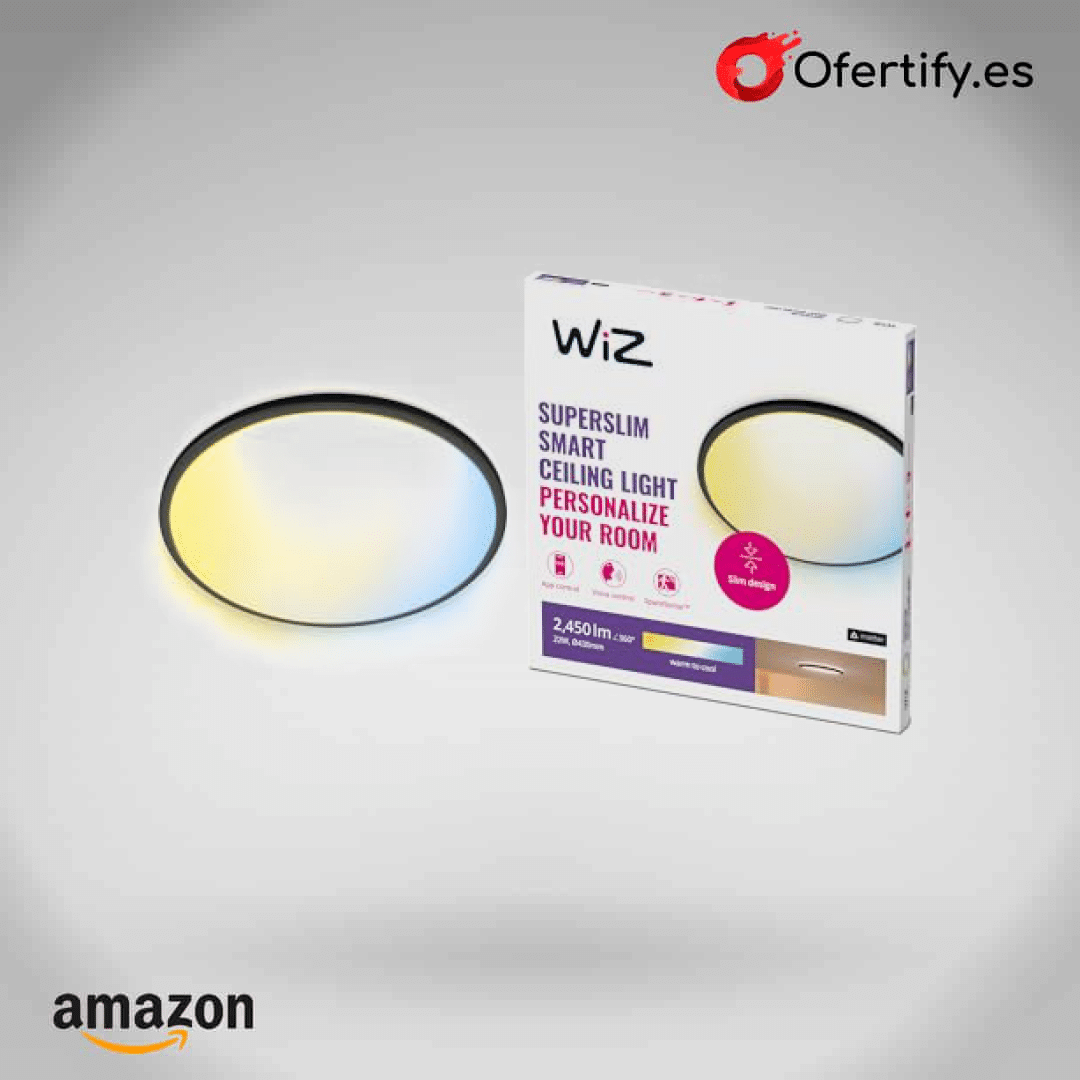 Ilumina tu hogar con estilo y tecnología avanzada. La lámpara de techo WiZ Superslim en negro, con 22 W regulable y conectividad Wi-Fi, ofrece control inteligente con Alexa y Google Home. Gracias a su tecnología SpaceSense, ajusta automáticamente la iluminación según tu ambiente. Fácil de instalar y elegante, transforma cualquier espacio. ¡Haz clic y descubre cómo mejorar tu hogar con esta innovadora lámpara!