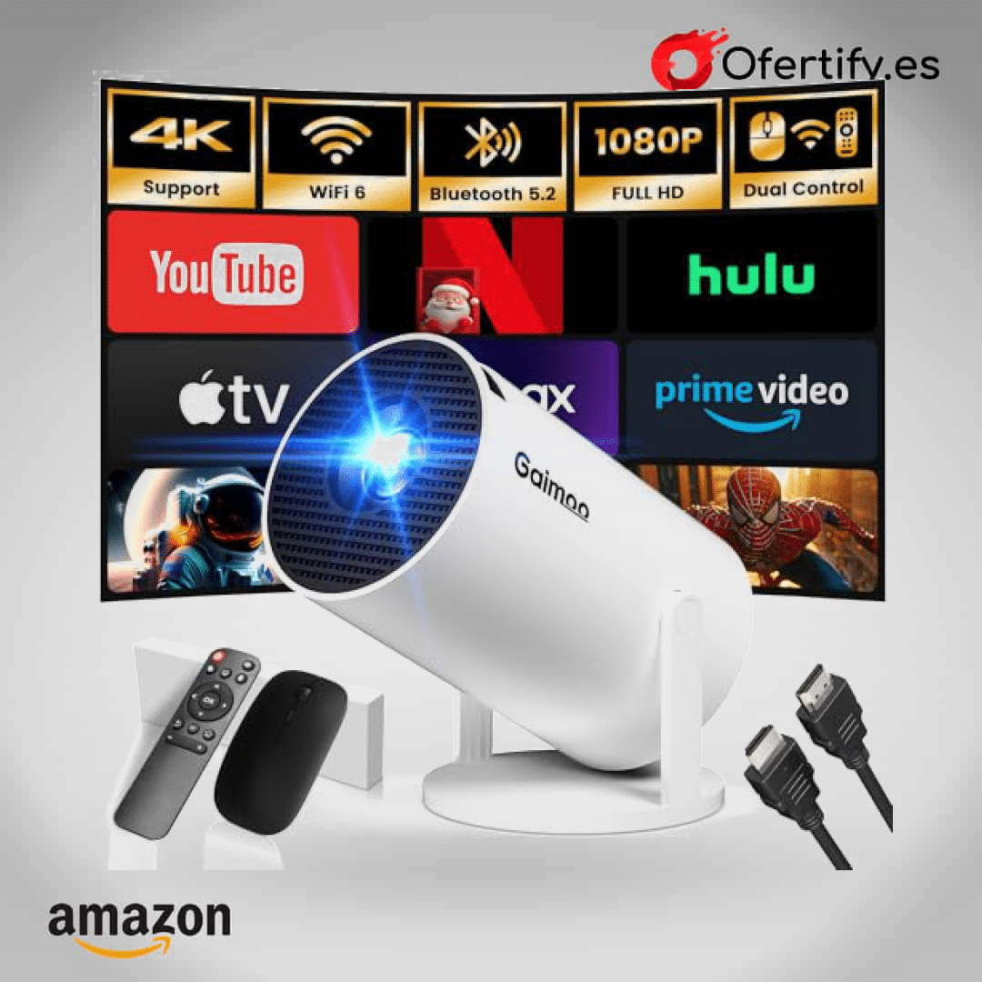 ¡Transforma tu entretenimiento con el Proyector Gaimoo GM200! Disfruta de imágenes 4K, control dual con ratón incluido y Android TV integrado para acceder a YouTube, Netflix y más sin dispositivos adicionales. Con WiFi 6, Bluetooth 5.2 y corrección automática, crea tu cine en casa en pantallas de hasta 240